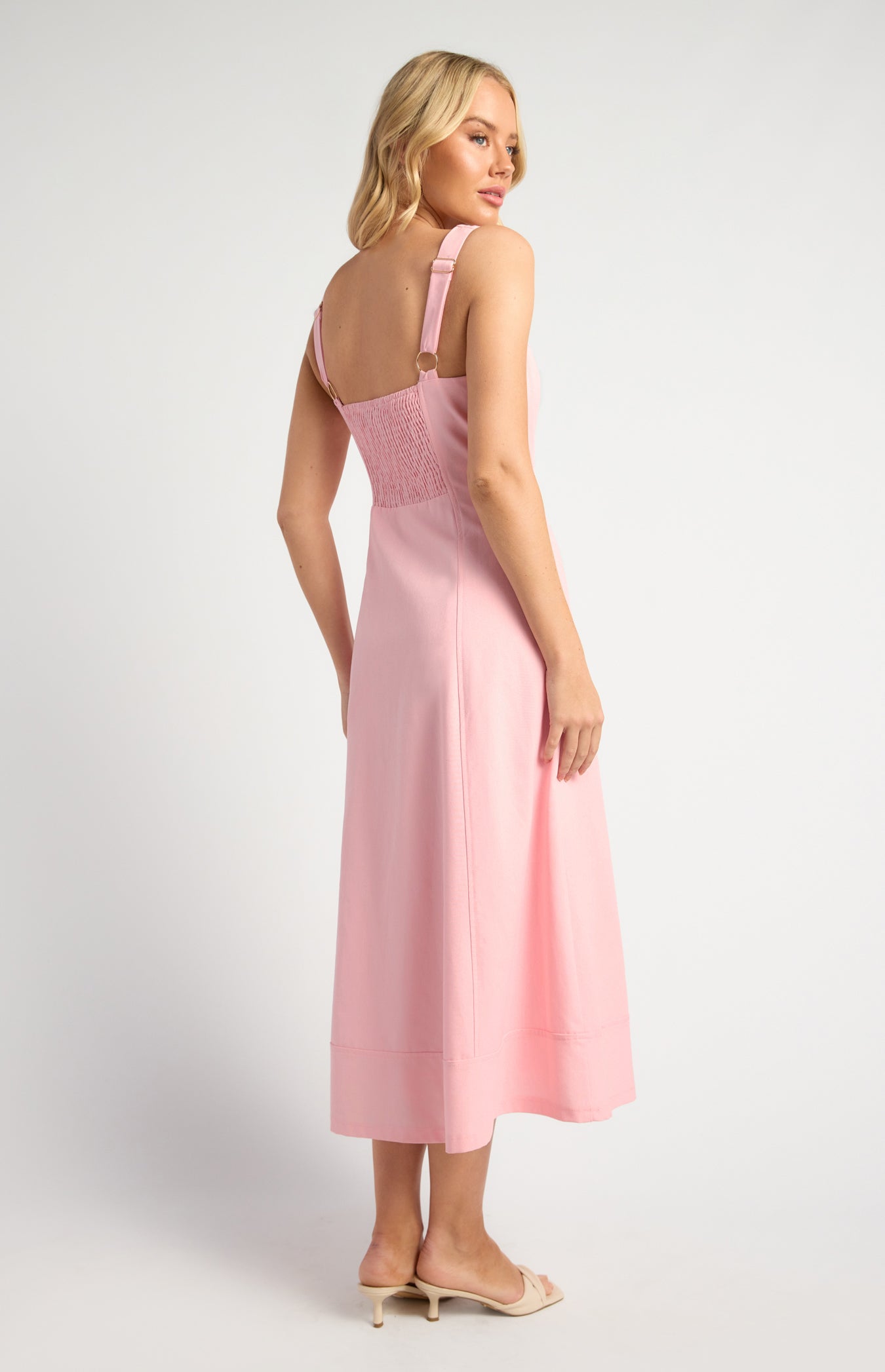 Embrace timeless elegance with the Asha Midi Panel Detail Cotton Linen Dress. Crafted from breathable cotton linen, this dress offers a refined silhouette enhanced by subtle panel detailing. Its midi length provides graceful coverage, ideal for both casual outings and sophisticated gatherings. Lightweight and comfortable, it effortlessly blends style with ease for an understated yet polished look.