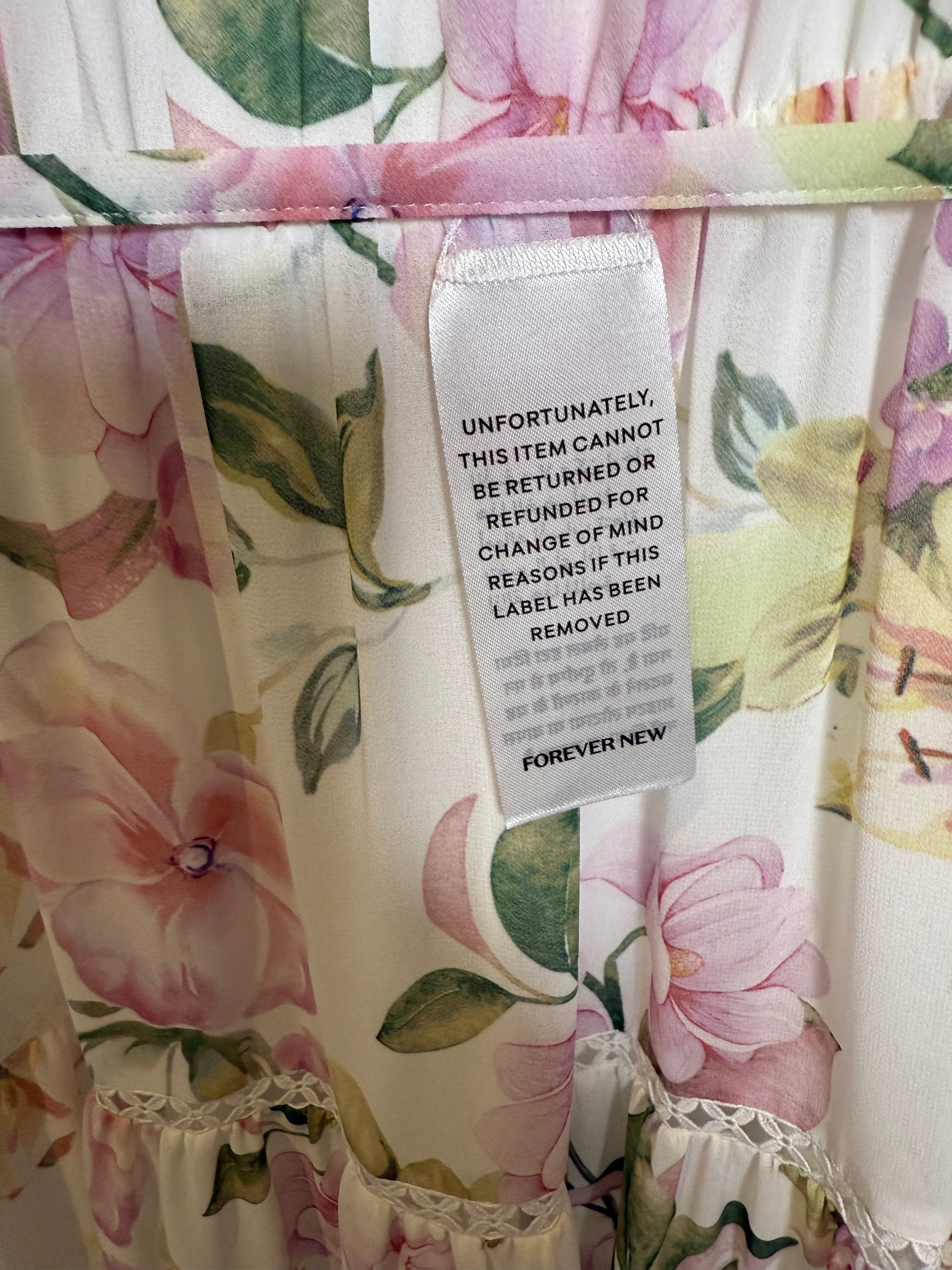 Elevate your elegance with the Forever New Long Beautiful Dress. Fully lined for comfort and style, this stunning gown features delicate lace trim and eye-catching gold buttons that add a touch of sophistication. The matching belt cinches the waist for a flattering silhouette, making it an ideal choice for weddings and special occasions. Step into timeless beauty and make every moment unforgettable.